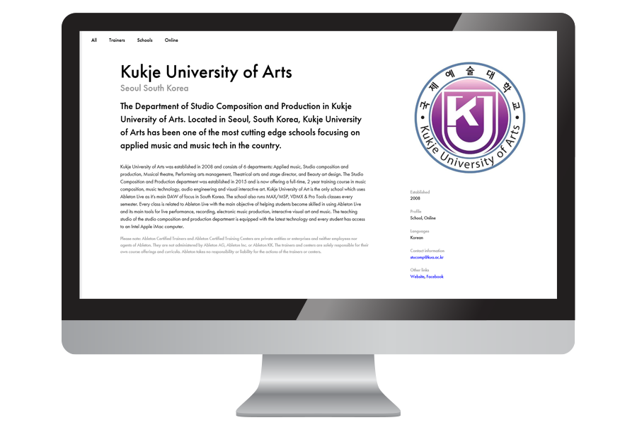 매킨토시 컴퓨터를 기반으로 기초적인 시퀀싱과 미디 개념을 이해하고 프로그램의 실행을 익힙니다. 에이블톤 라이브는 일렉트로니카 Djing, 기타 컴퓨터를 사용하는 라이브 퍼포먼스에서 매우 사용 빈도가 높은 음악 프로그램입니다. 기본적인 DAW 기능과 함께 특유의 Session View를 통해 다양한 악기의 음향을 실시간으로 조합하여 연주하는 기능을 배워 나갑니다. 스튜디오작곡 전공은 에이블톤 국제 공인 교육기관으로 졸업 시 일정 기준을 충족하면 에이블톤 라이브 어드벤스 과정 수료증을 받을 수 있습니다.
